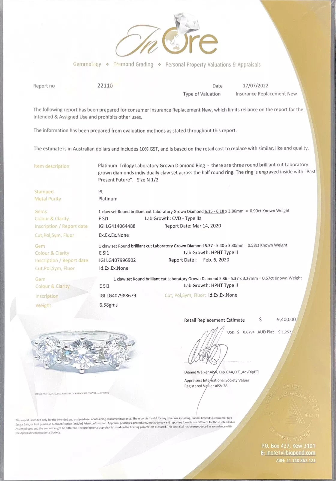 Condition: Great - Valuation And Physical Copies Of Electronic Diamond Reports 17/07/2022 Included Valued at $9,400.