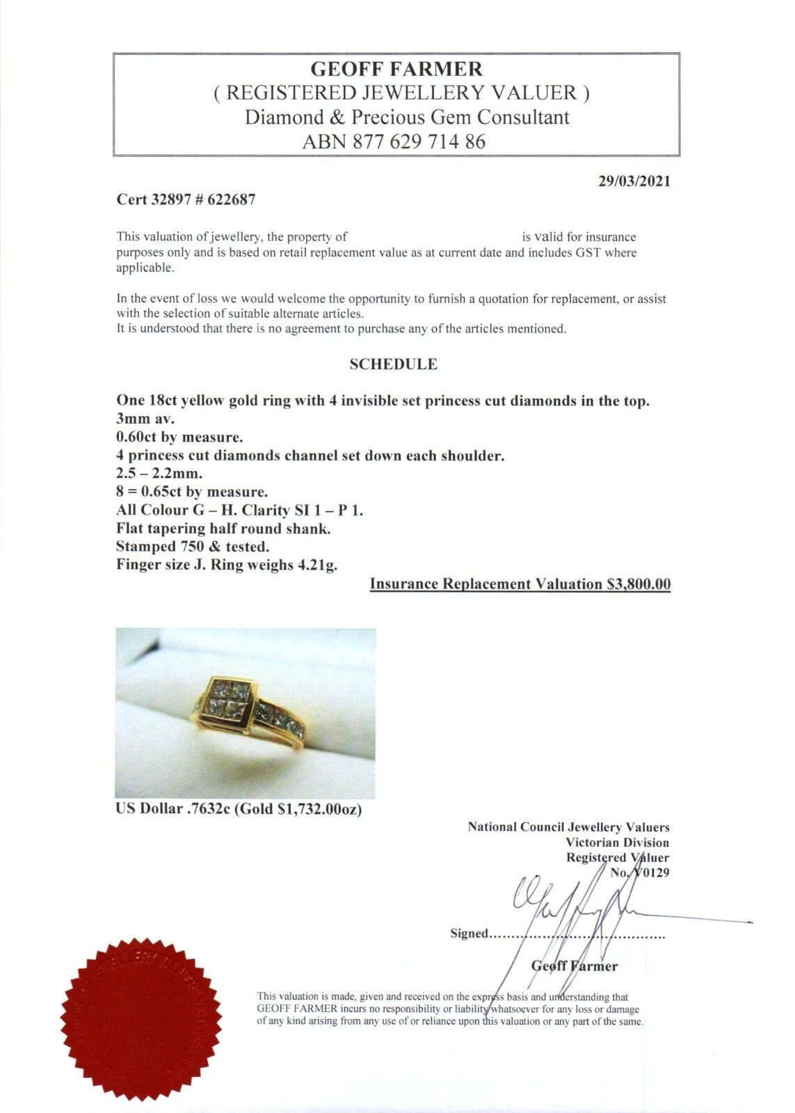 18Ct Yellow Gold 1.25Ct TW Princess Cut Invisible Set Diamond Ring Sz J