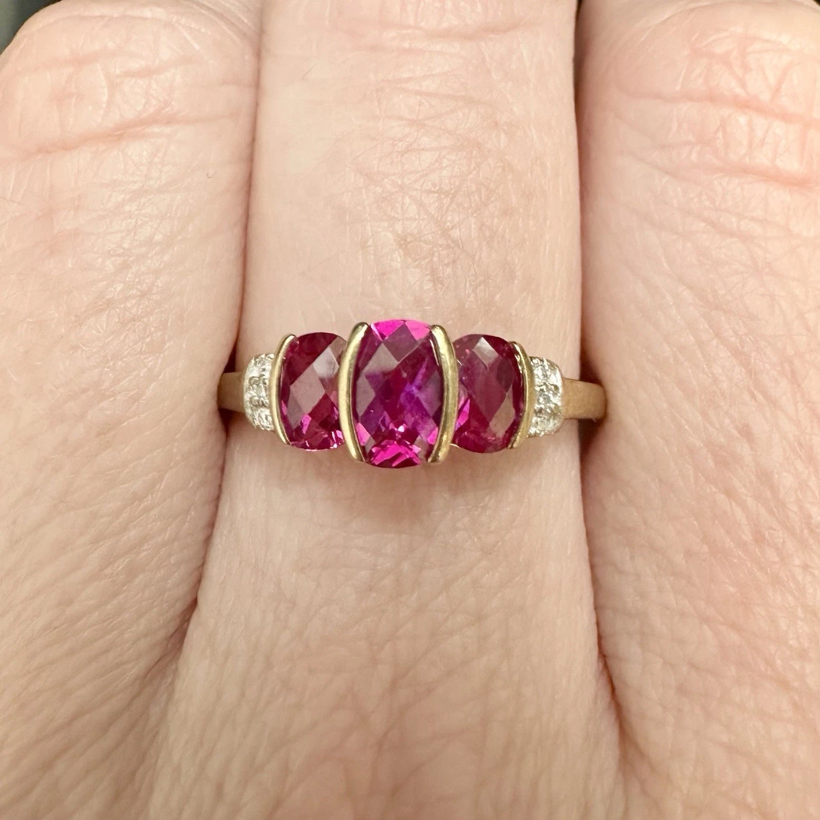 9Ct Yellow Gold Created Ruby Trilogy and Diamond Accent Ring Sz Q