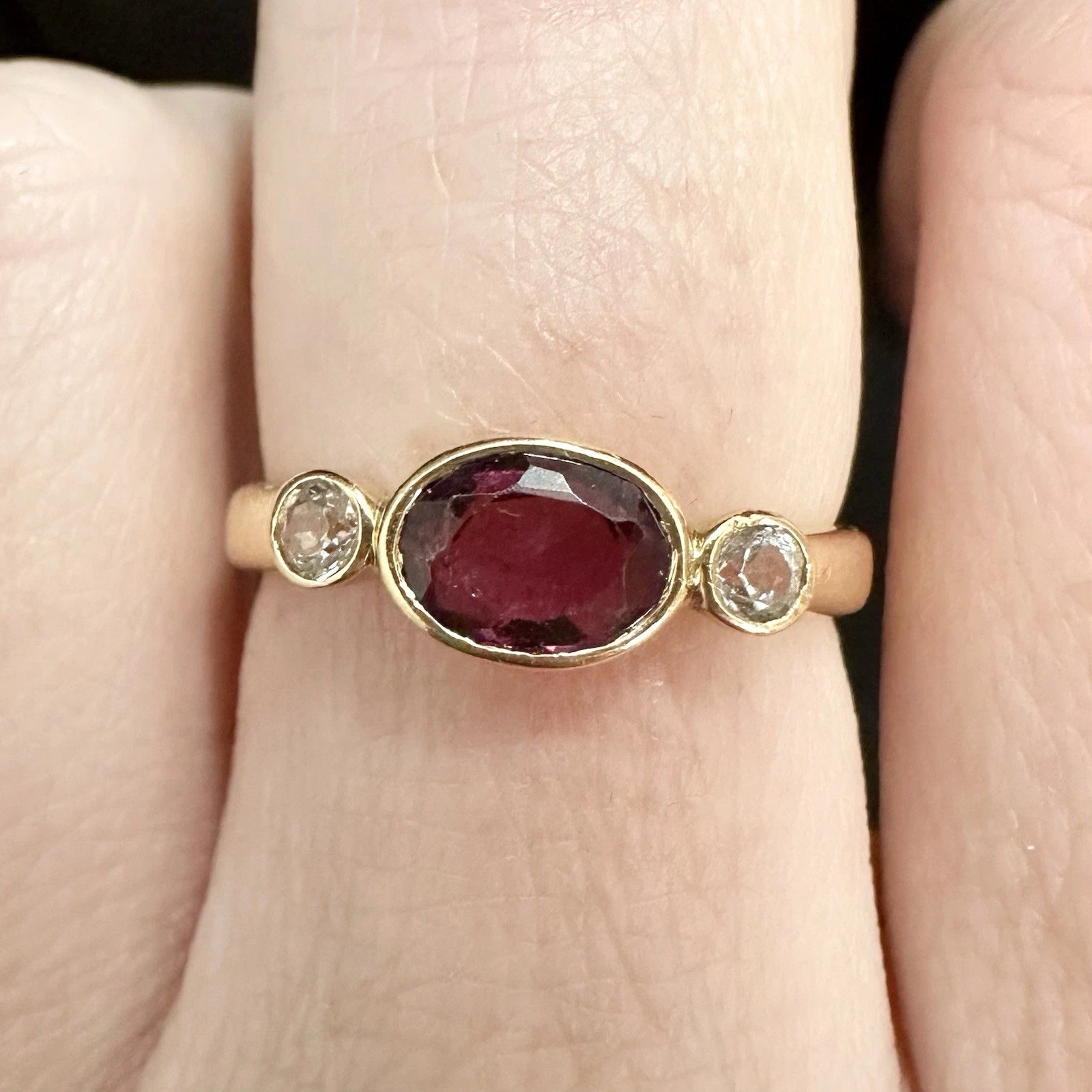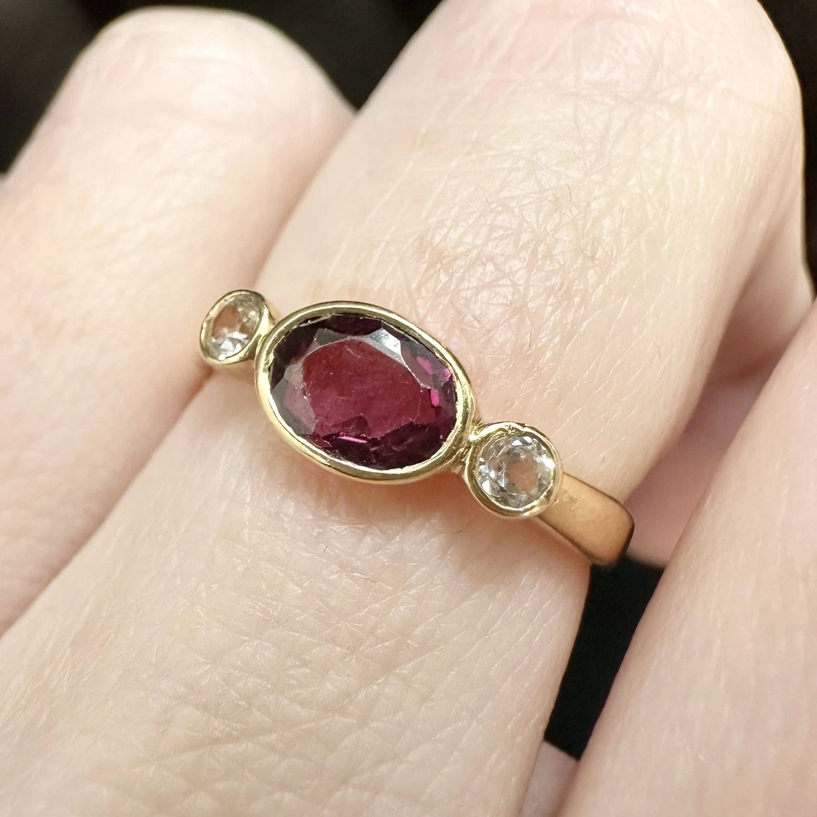 18Ct Yellow Gold Created Rhodolite and CZ Accent Ring - Sz L 1/2