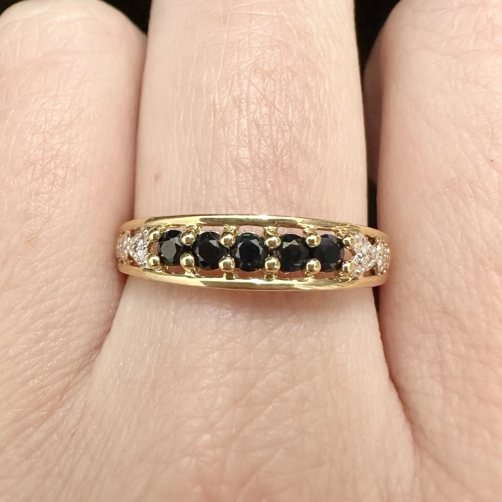 9Ct Yellow Gold Sapphire & Diamond Accent Band Ring - Sz Q 1/2