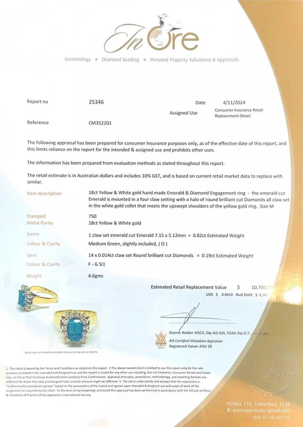 18Ct Two-Toned Gold .82 Carat Emerald & .19 Carat Diamond Dress Ring Sz M