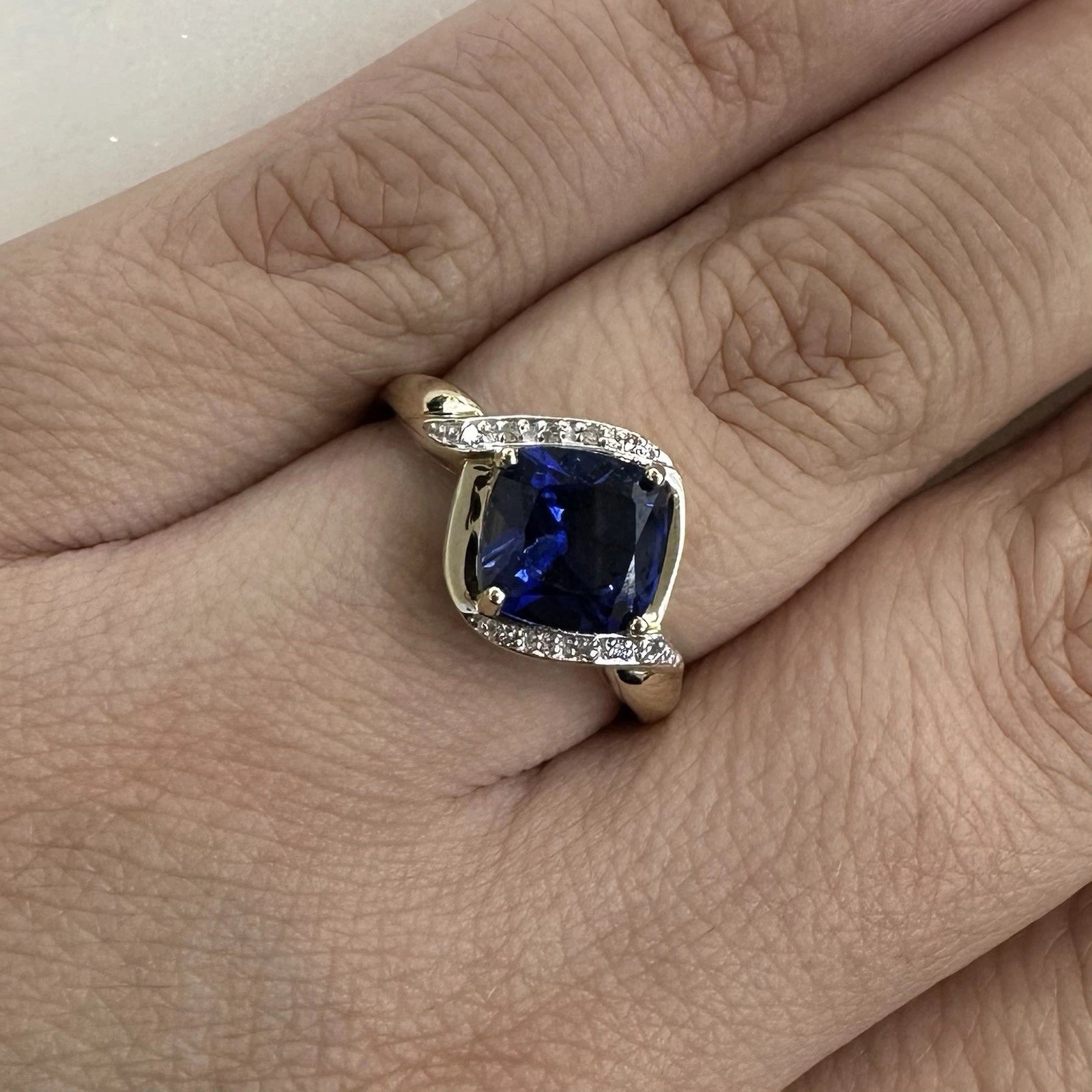 9Ct Yellow Gold Cushion Cut Created Sapphire & Diamond Ring - Sz Q 1/2