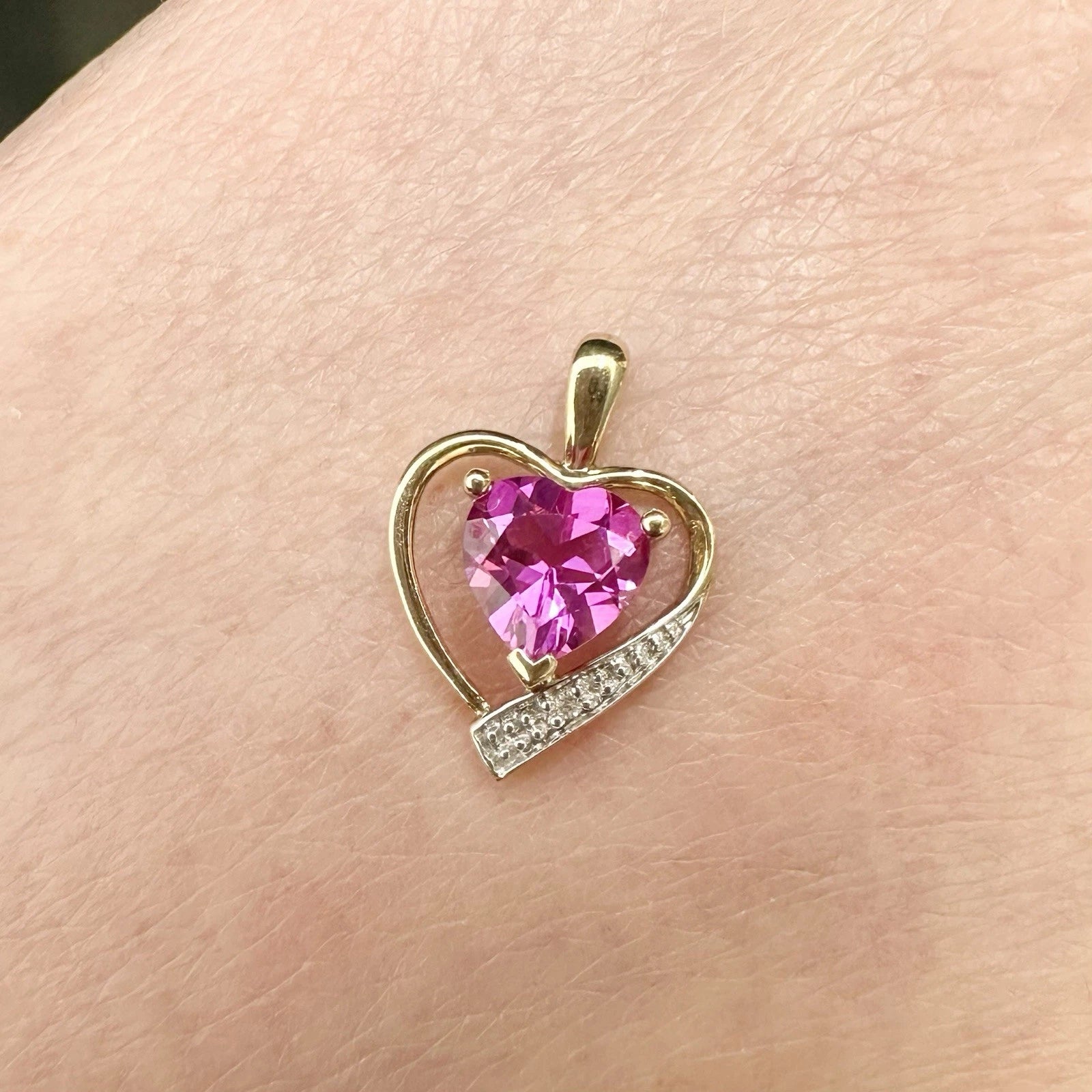 9Ct Yellow Gold Created Pink Sapphire & Diamond Accent Heart Pendant