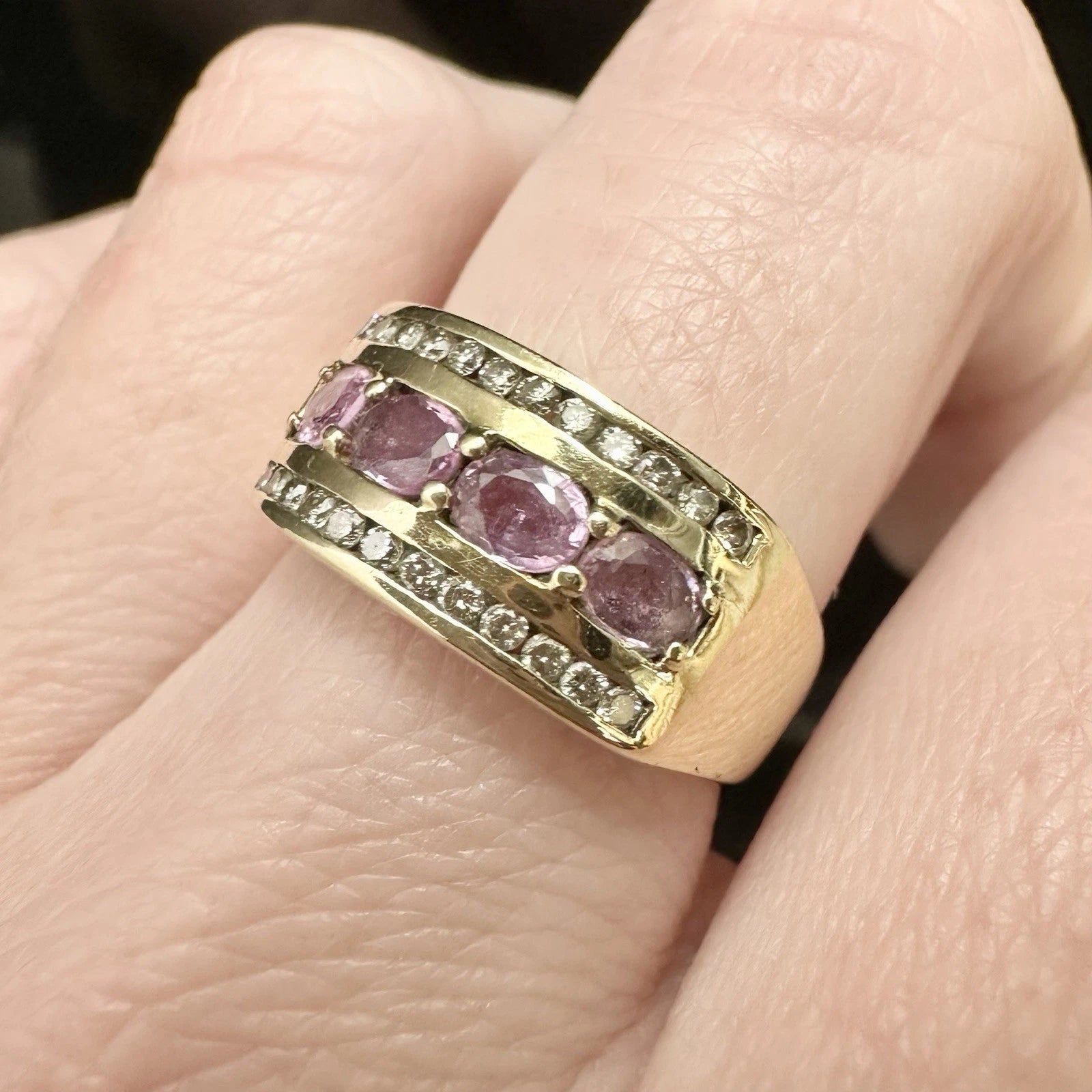 9Ct Yellow Gold Pink Sapphire & Diamond Band Ring Sz M 1/2
