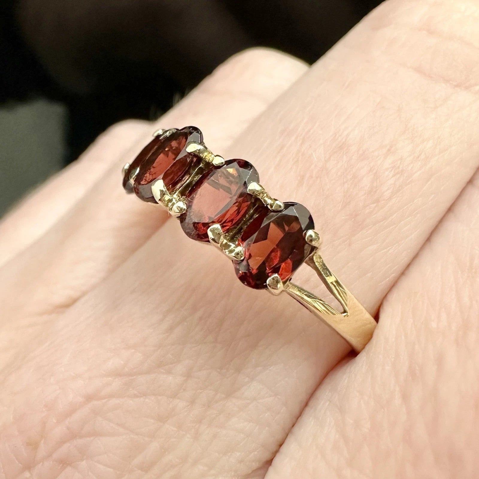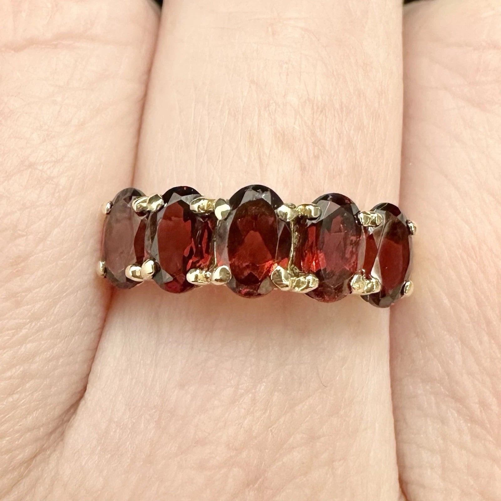 9Ct Yellow Gold Five Stone Garnet Band Ring Sz P 1/2
