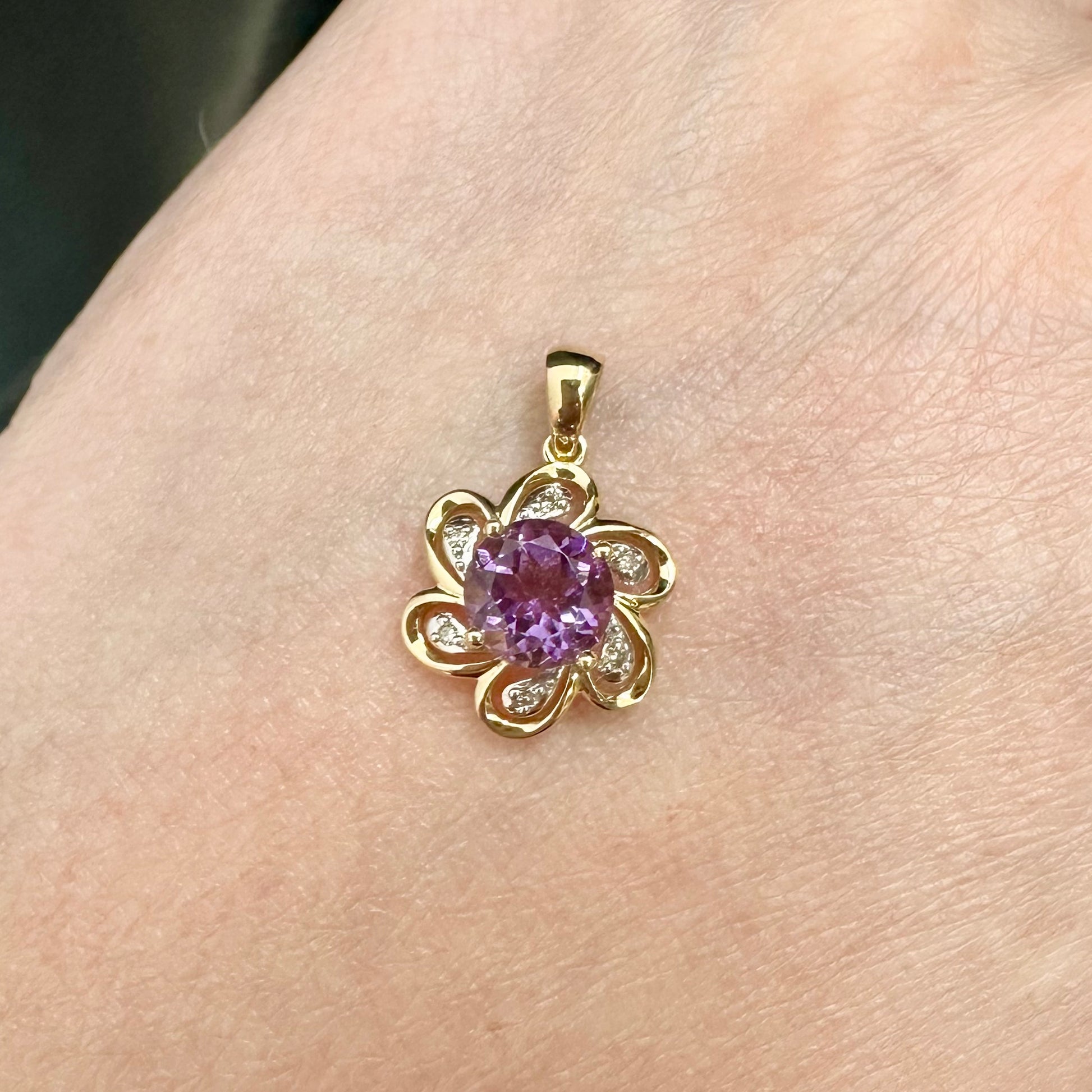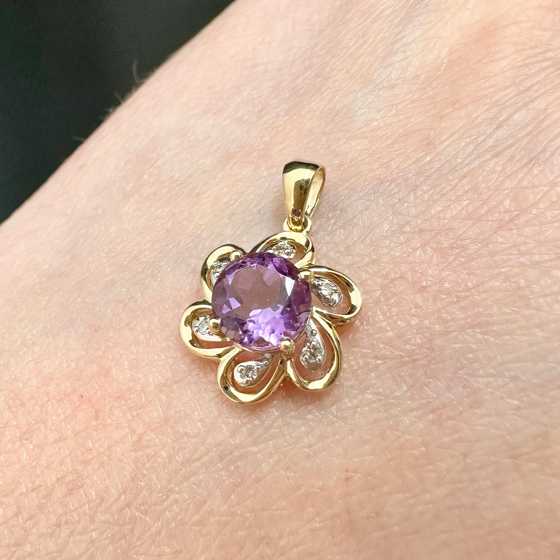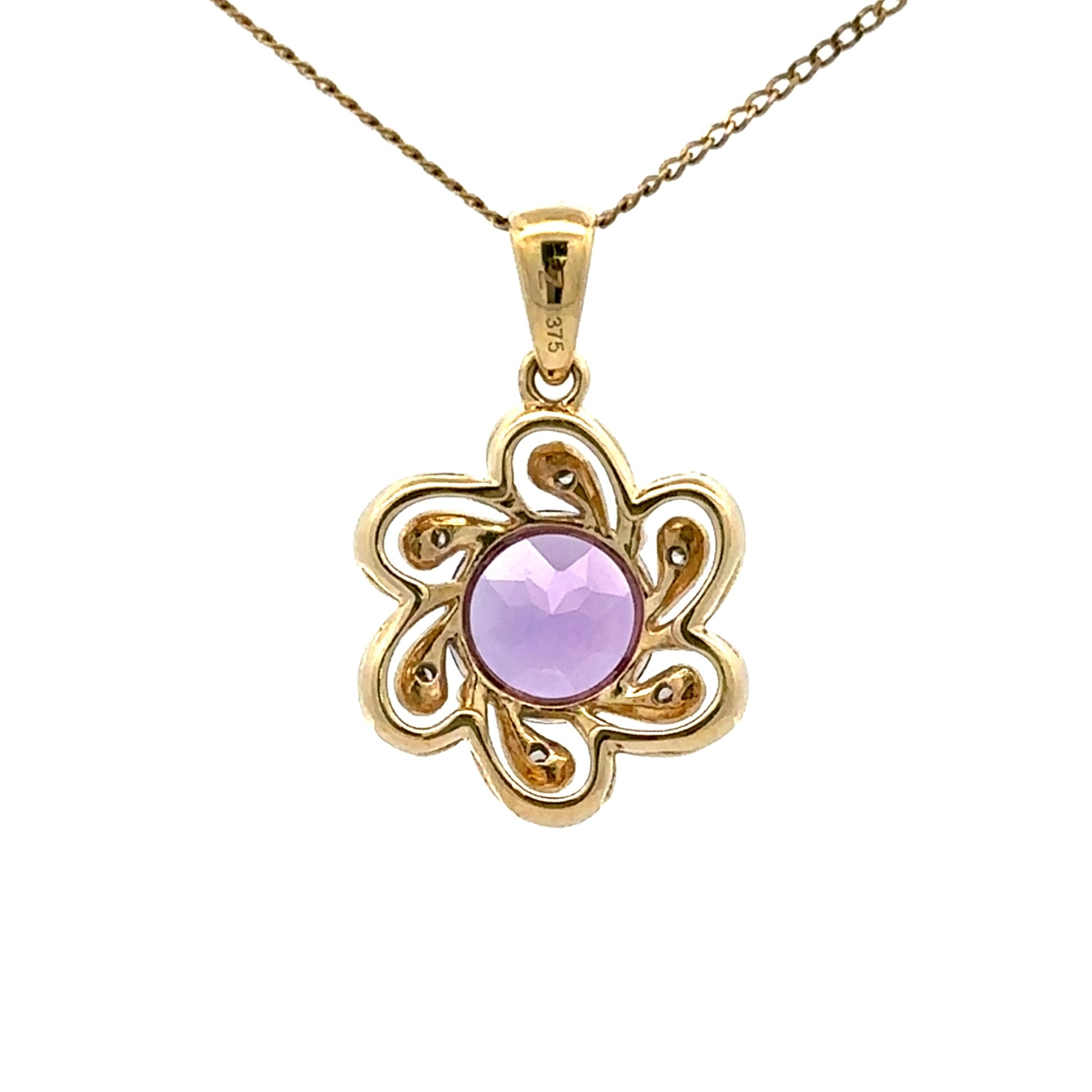 9Ct Yellow Gold Amethyst & Diamond Set Flower Pendant