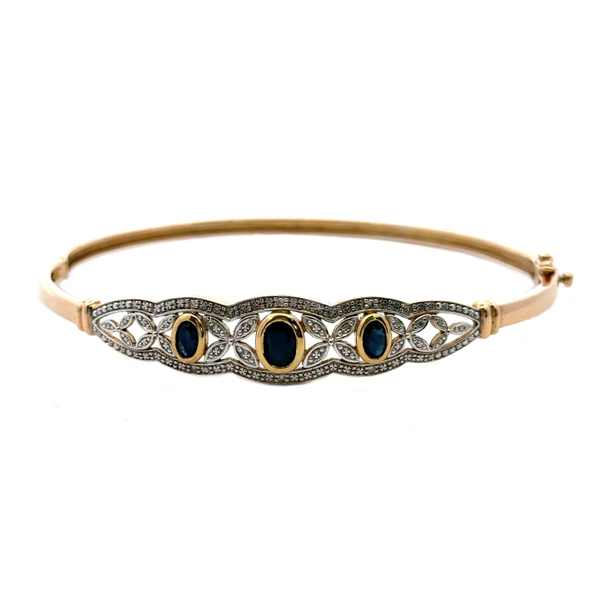 9Ct Yellow Gold Filigree Sapphire & Diamond Hinged Oval Bangle 19cm